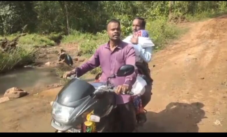 ଶବ ନେବା ପାଇଁ ହଇରାଣ : ରାସ୍ତା ନ ଥିବାରୁ ଶବ କୁ ନେଲେ ମୋଟରସାଇକେଲ ରେ l